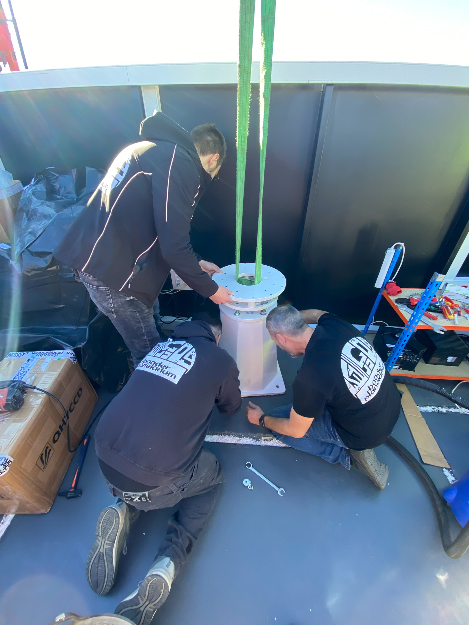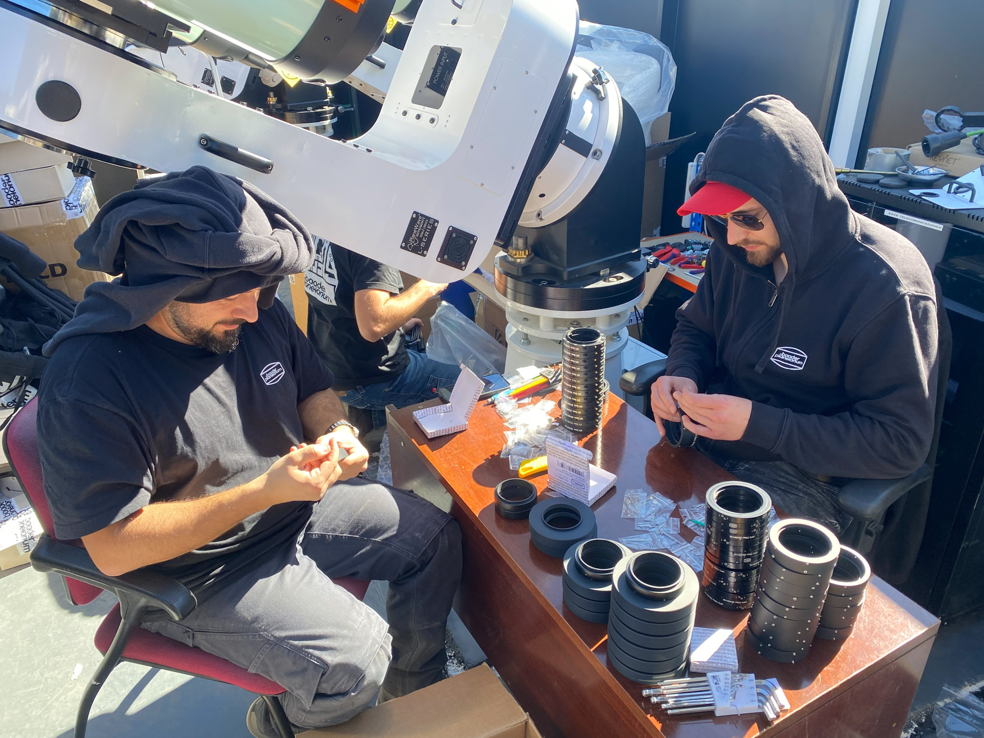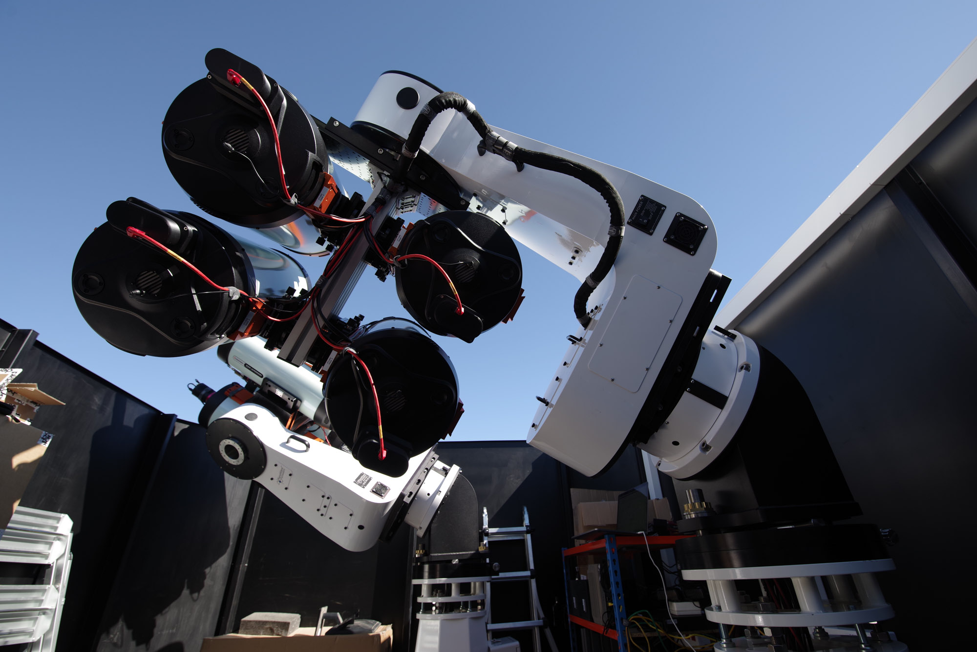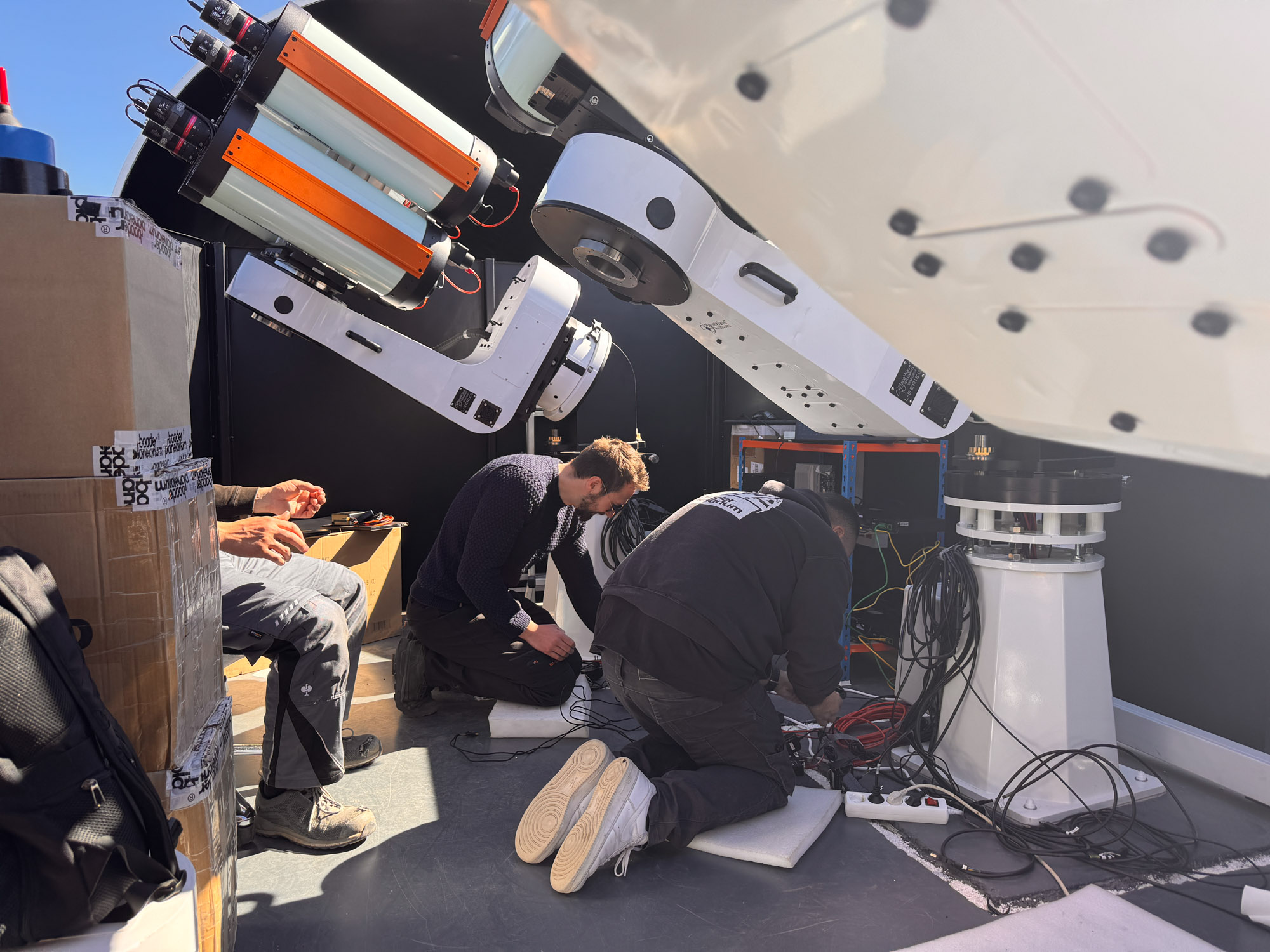 Die Installation von 16 Teleskopen, Kameras, Motorfokussen und vier Montierungen in nur einer Woche ist eine beeindruckende Leistung. Zudem hat sich die Integration der Hardware in unser Steuerungssystem ebenfalls als sehr erfolgreich erwiesen.Erste Tests zeigen, dass wir noch einige kleine Probleme mit einigen Hardwarekomponenten lösen müssen. Nichts Unerwartetes. Wahrscheinlich müssen wir etwas mehr Zeit in die Ausrichtung und das Tilten einiger Tuben investieren sowie in ein paar weitere Kleinigkeiten.