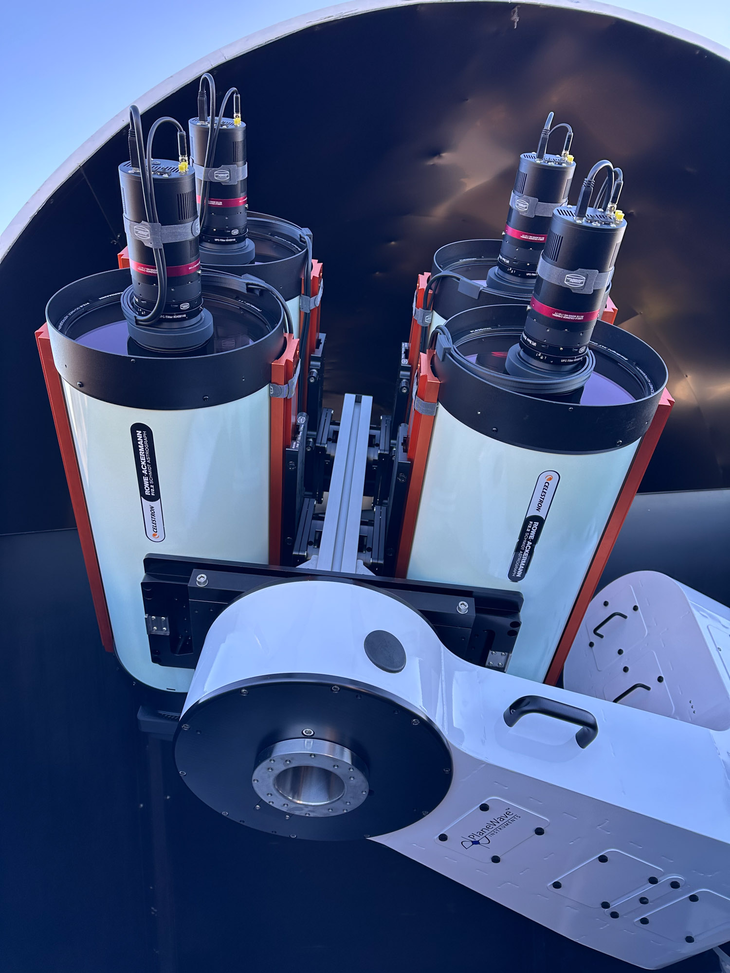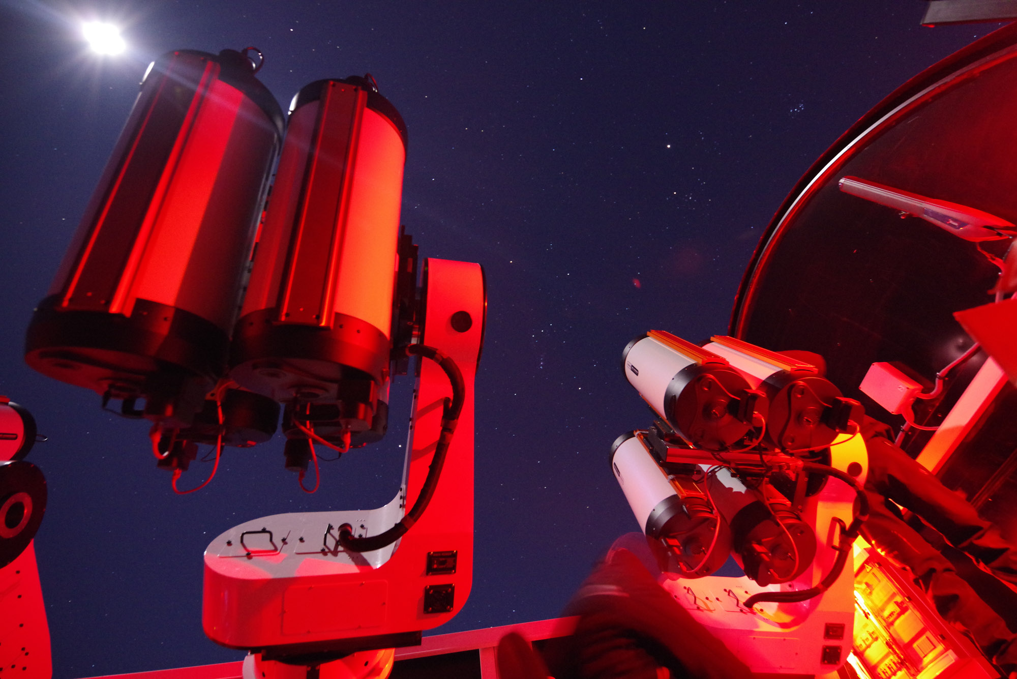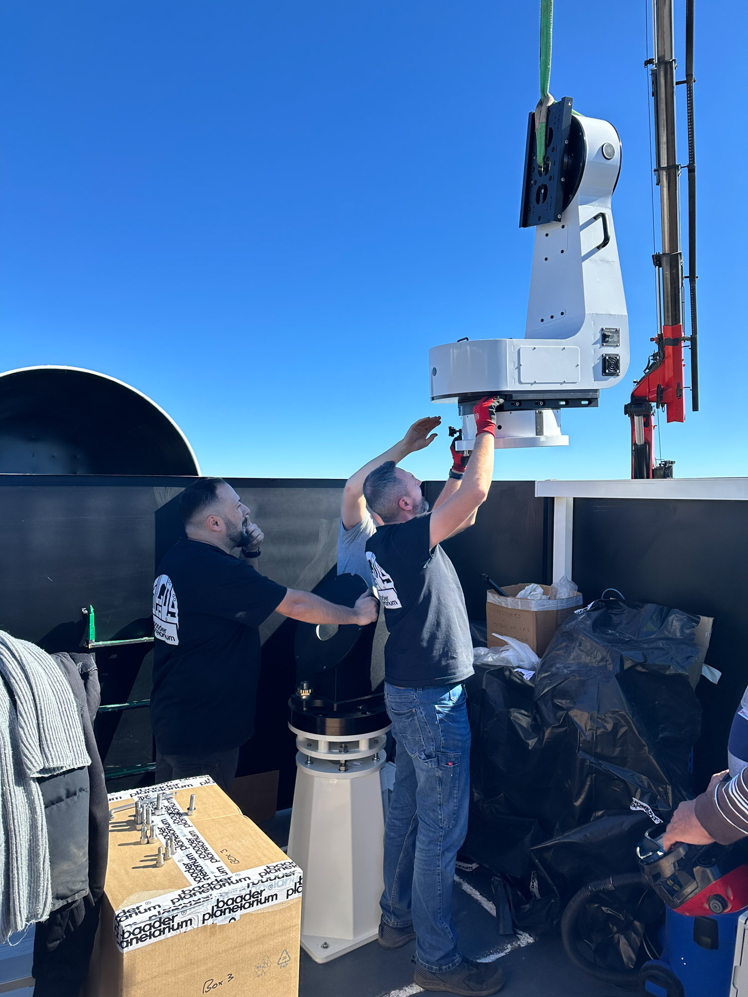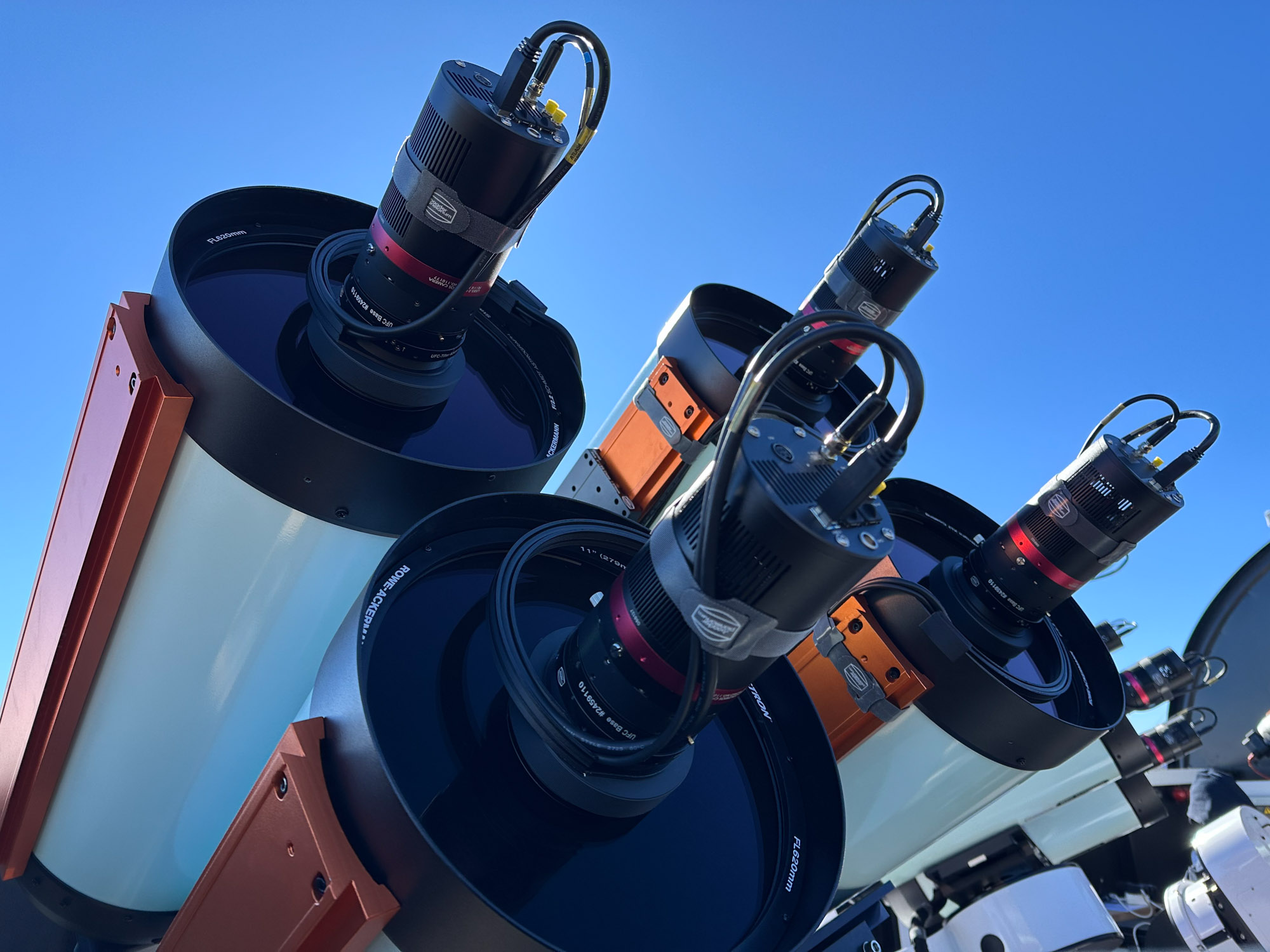 Die Installation von 16 Teleskopen, Kameras, Motorfokussen und vier Montierungen in nur einer Woche ist eine beeindruckende Leistung. Zudem hat sich die Integration der Hardware in unser Steuerungssystem ebenfalls als sehr erfolgreich erwiesen.Erste Tests zeigen, dass wir noch einige kleine Probleme mit einigen Hardwarekomponenten lösen müssen. Nichts Unerwartetes. Wahrscheinlich müssen wir etwas mehr Zeit in die Ausrichtung und das Tilten einiger Tuben investieren sowie in ein paar weitere Kleinigkeiten.