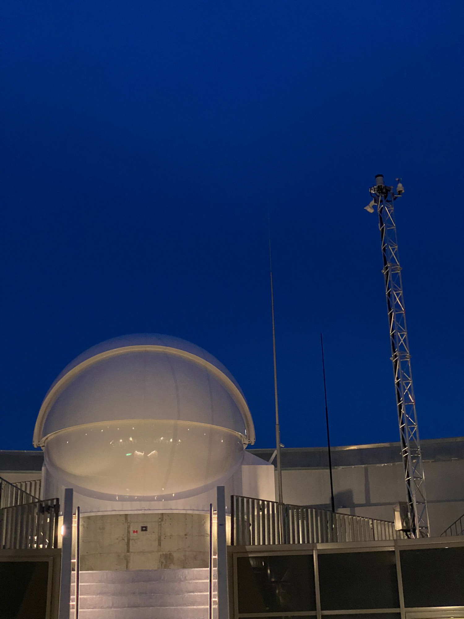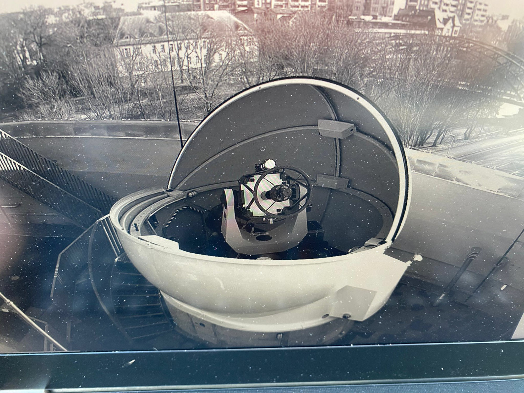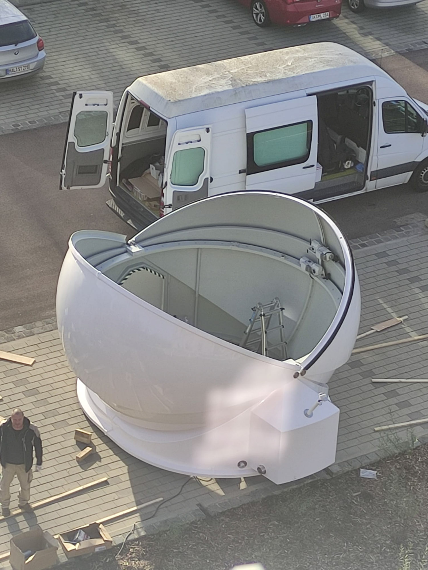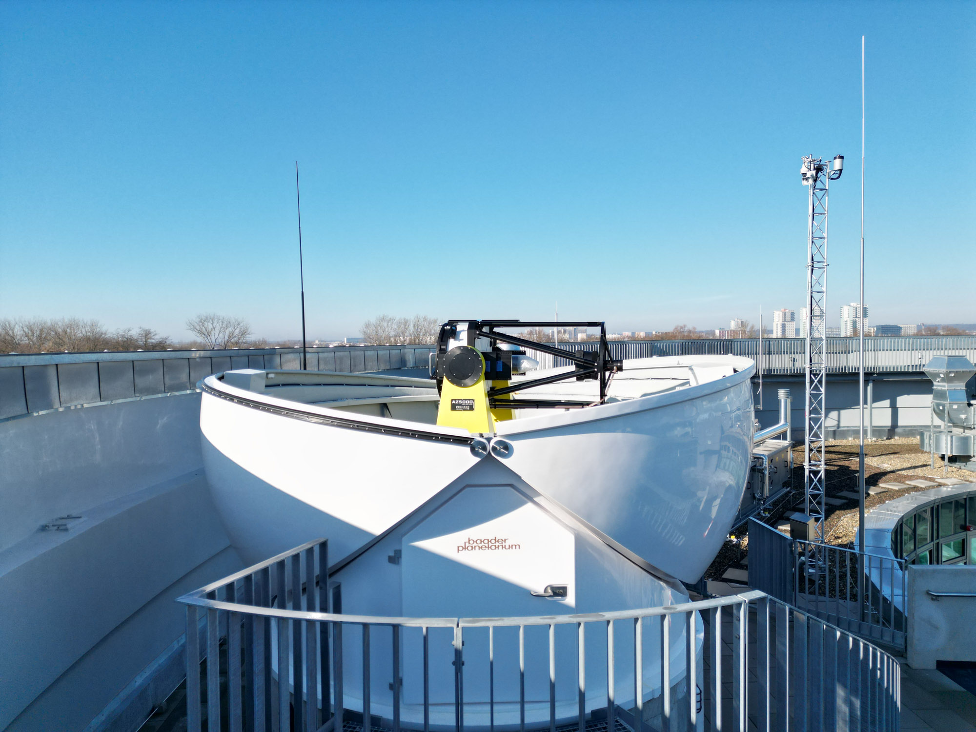 Im Rahmen des ersten Installationstermins im November 2022 wurde die Kuppel, eine Baader AllSky 4.5m, auf das neue Dach des Planetariums gehoben, ausgerichtet und verankert. Dabei wurde zugleich der Flansch für das später integrierte Teleskop mit Montierung installiert. Nach der vollständigen Montage der Kuppel wurde ein umfassender Funktionstest durchgeführt, um die Kuppel vor Ort auf Herz und Nieren zu prüfen; dieser Test wurde problemlos bestanden.