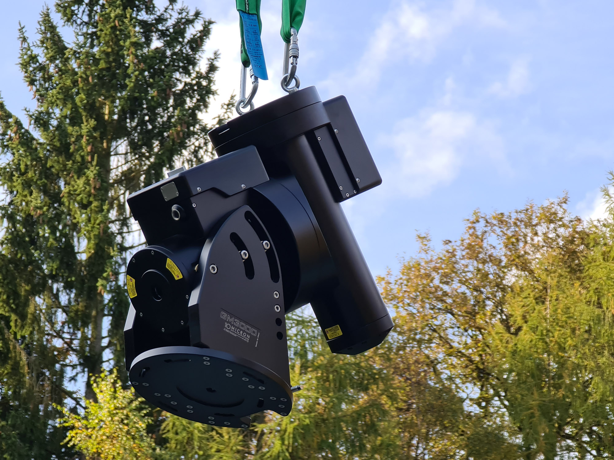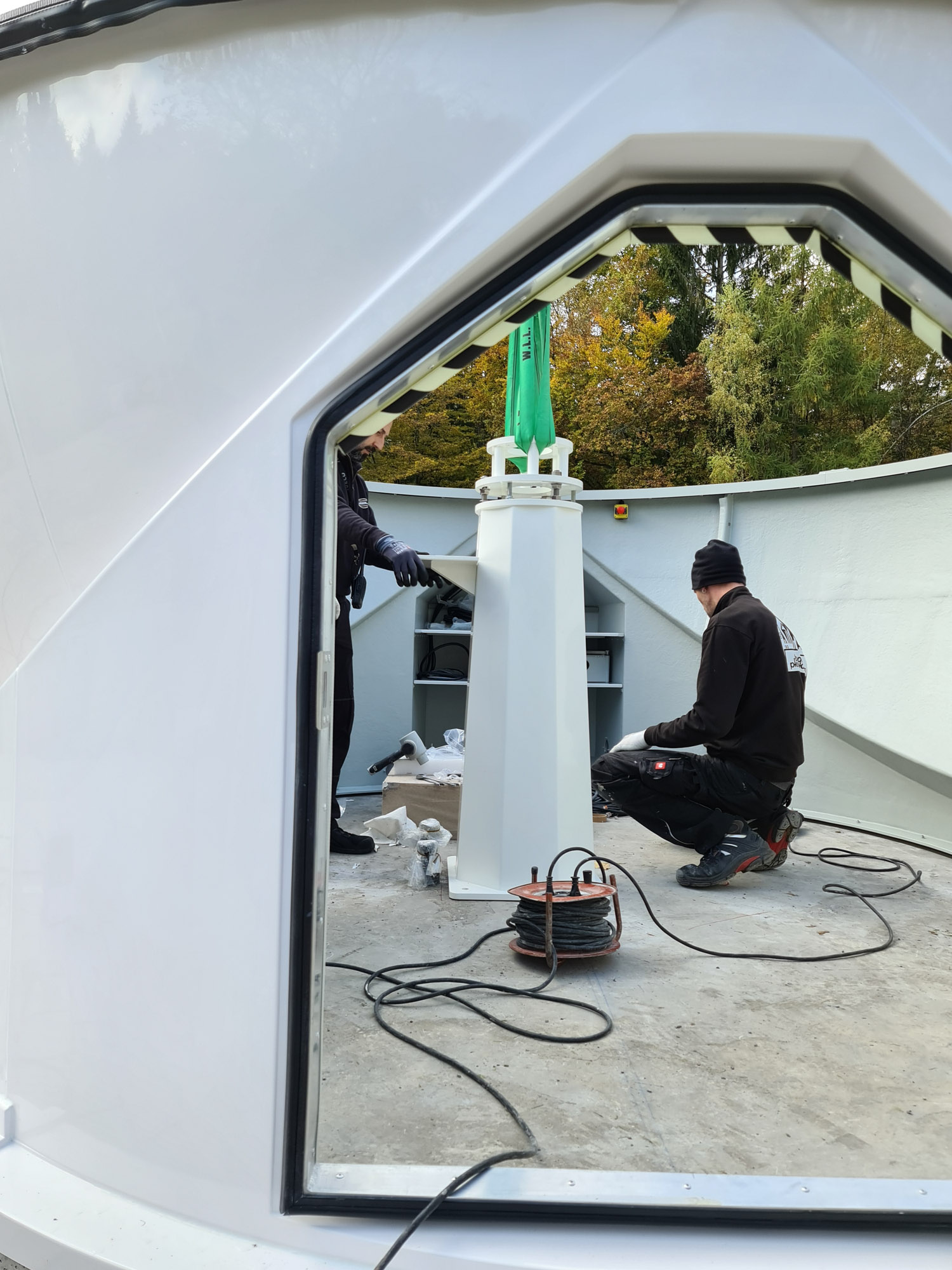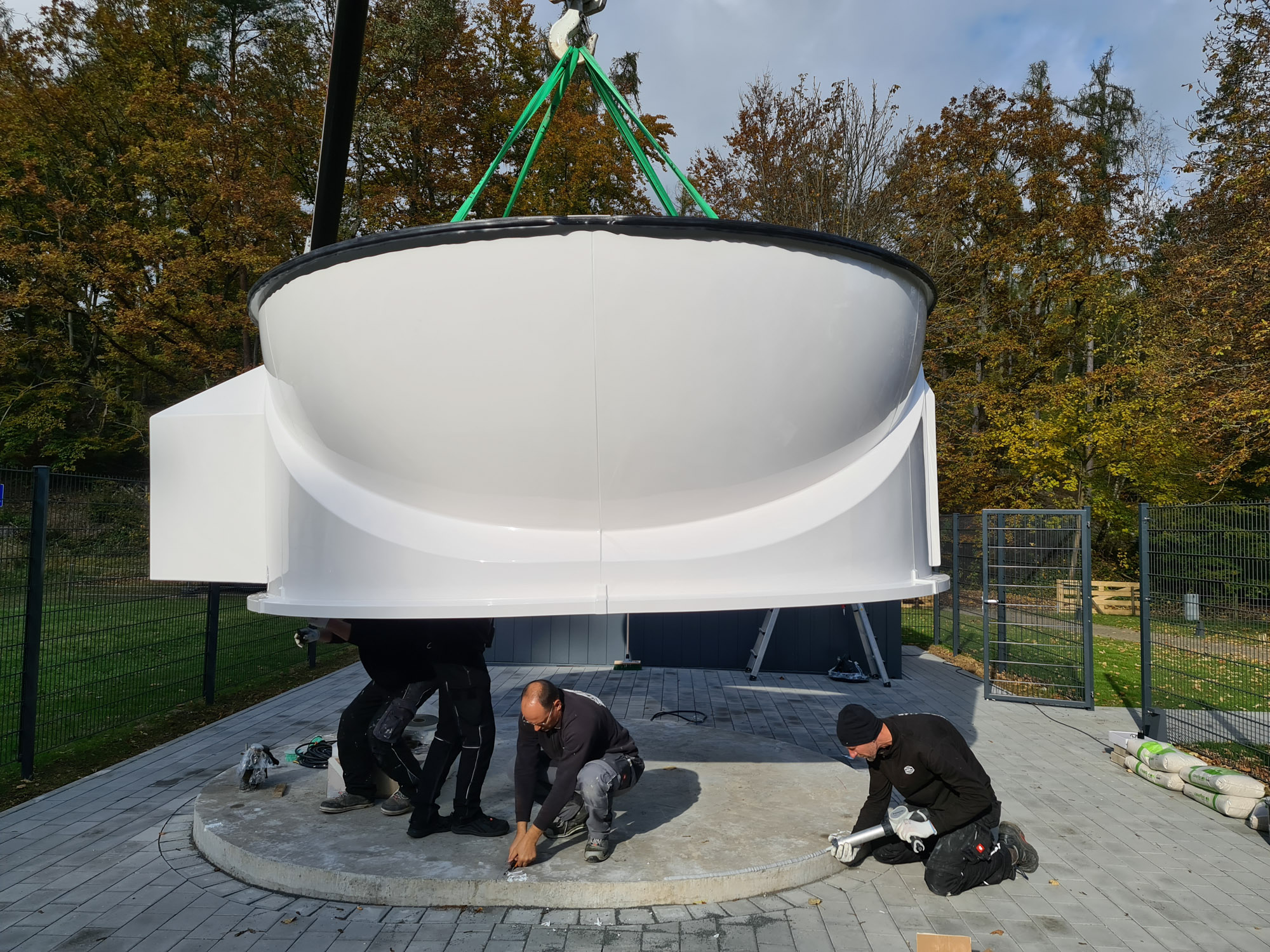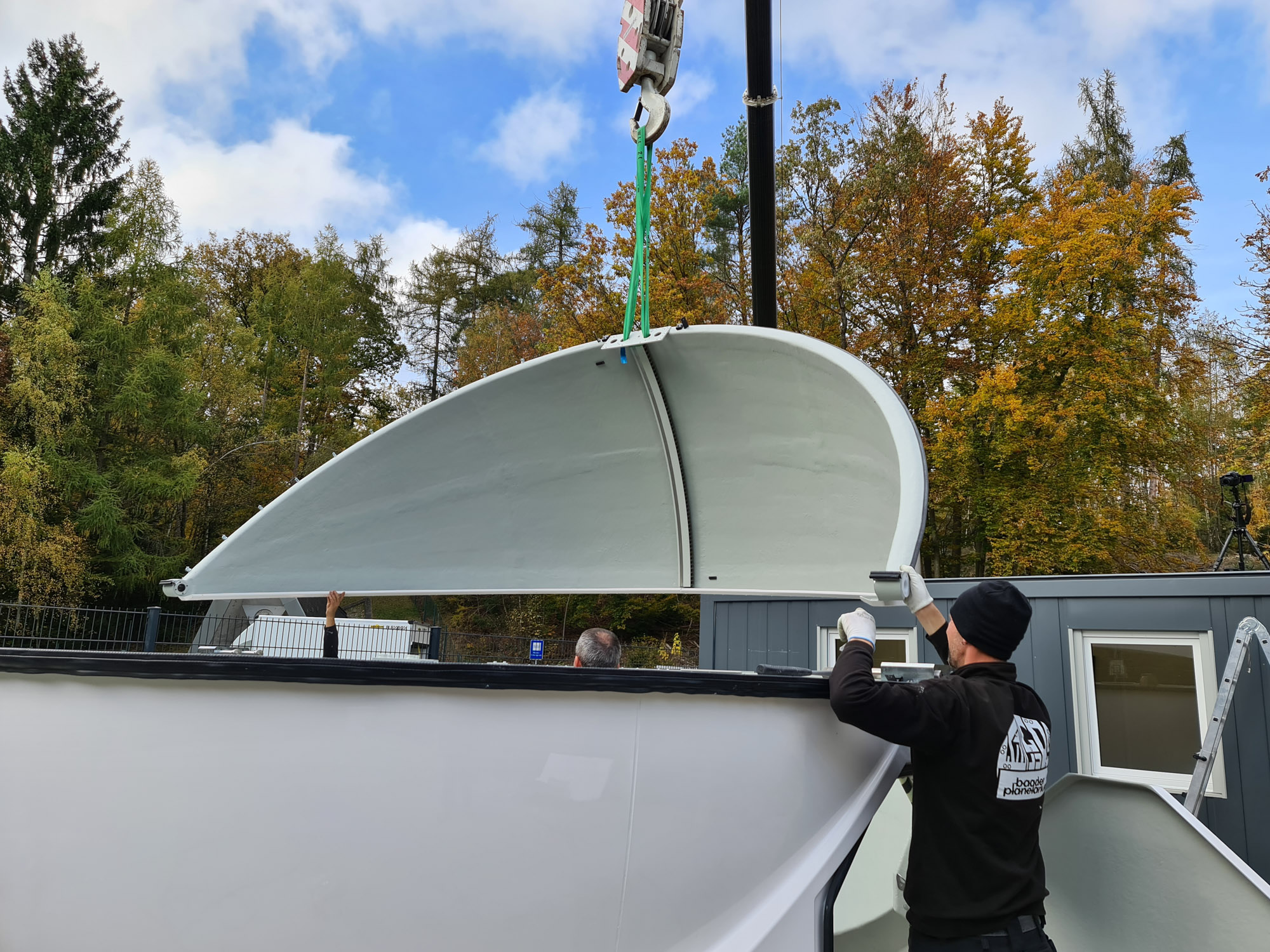 Nach Fertigstellung unserer massiv betonierten Kuppelbasis und der vorbereitenden Arbeiten war es Ende Oktober 2021 endlich soweit, und die Kuppel samt massiver Stahlsäule und 10 Micron GM 3000 Montierung wurden geliefert. Es war faszinierend zu beobachten, mit welcher Professionalität, Geschwindigkeit und Sorgfalt die Mitarbeiter von Baader Planetarium den Aufbau der Kuppel und die Installation der Montierung bewerkstelligten und dabei auch noch die Zeit fanden, unsere vielen Fragen zu beantworten, Tipps zu geben und uns eingehend einzuweisen. Besser geht es nicht! Die Kuppel hat nun den ersten Winter überstanden; wir konnten weder Undichtigkeiten noch Kondenswasser an der Innenseite oder irgendwelche anderen Probleme feststellen. Die Qualität der bis ins Detail durchdachten Konstruktion ist wirklich überzeugend.