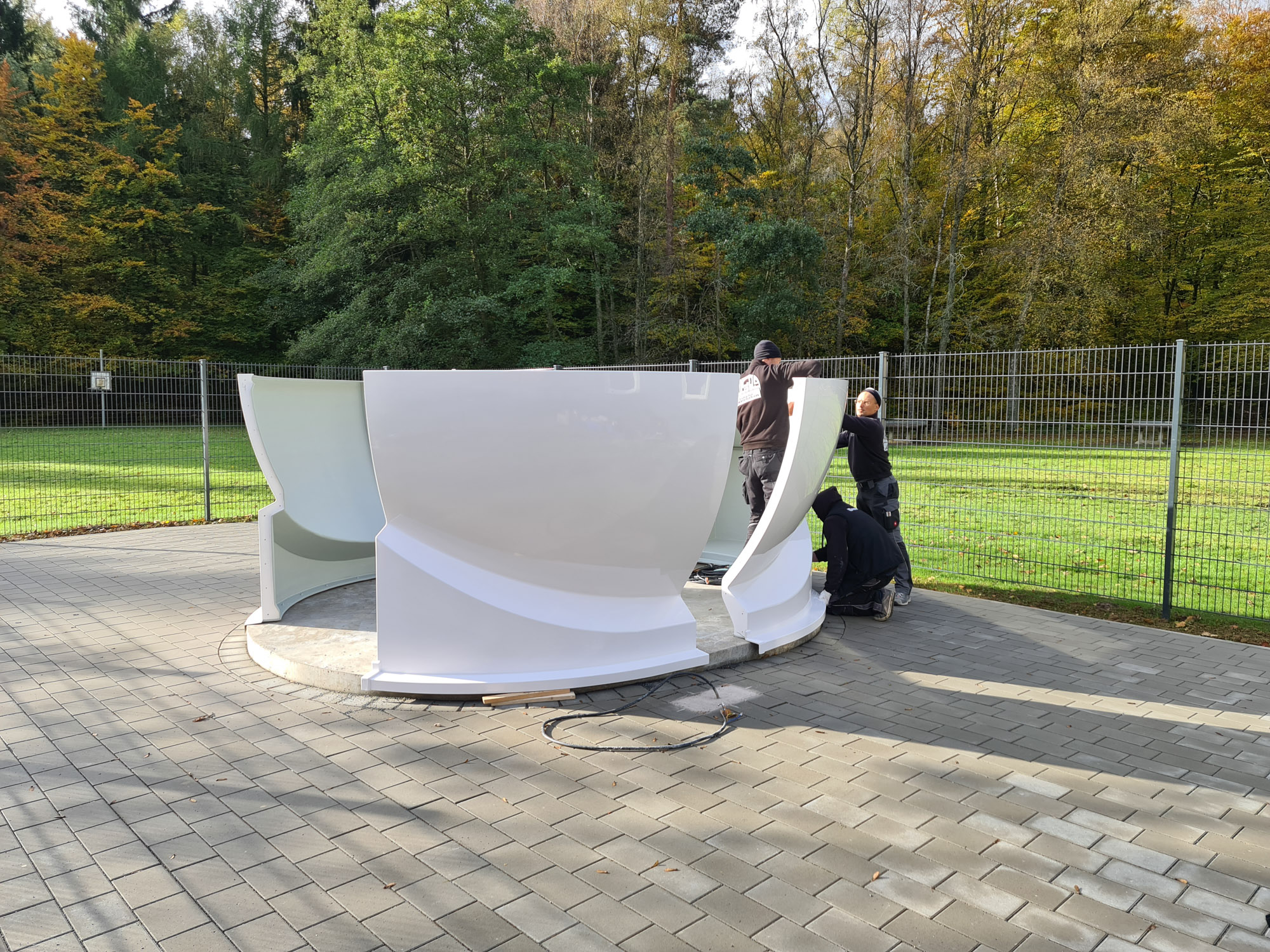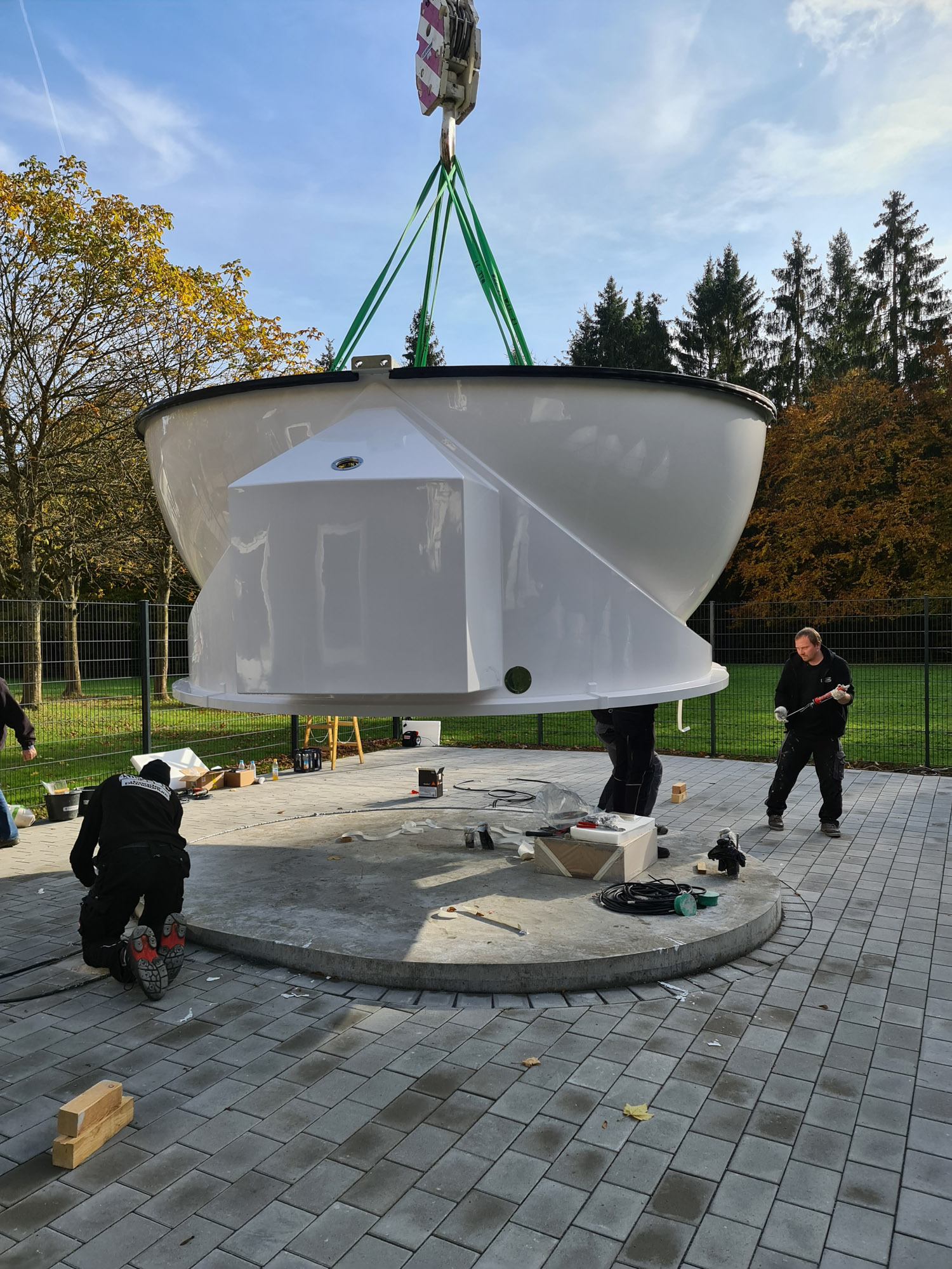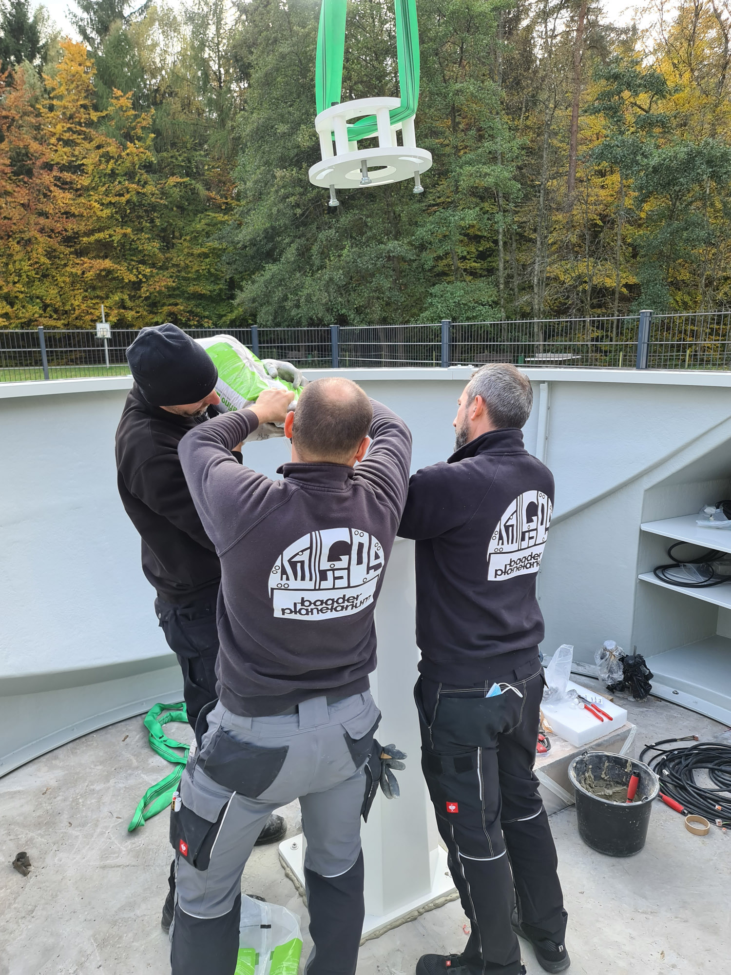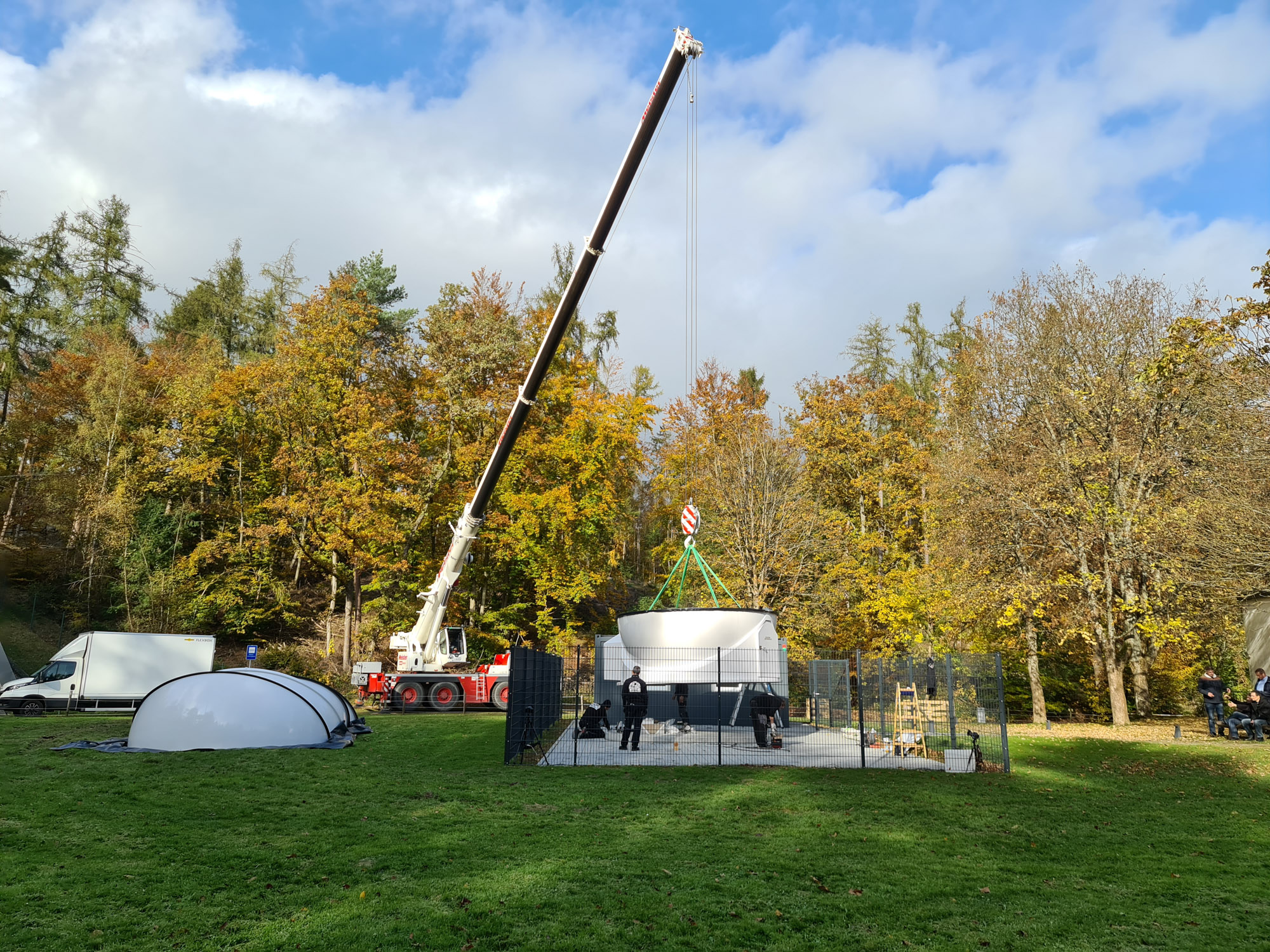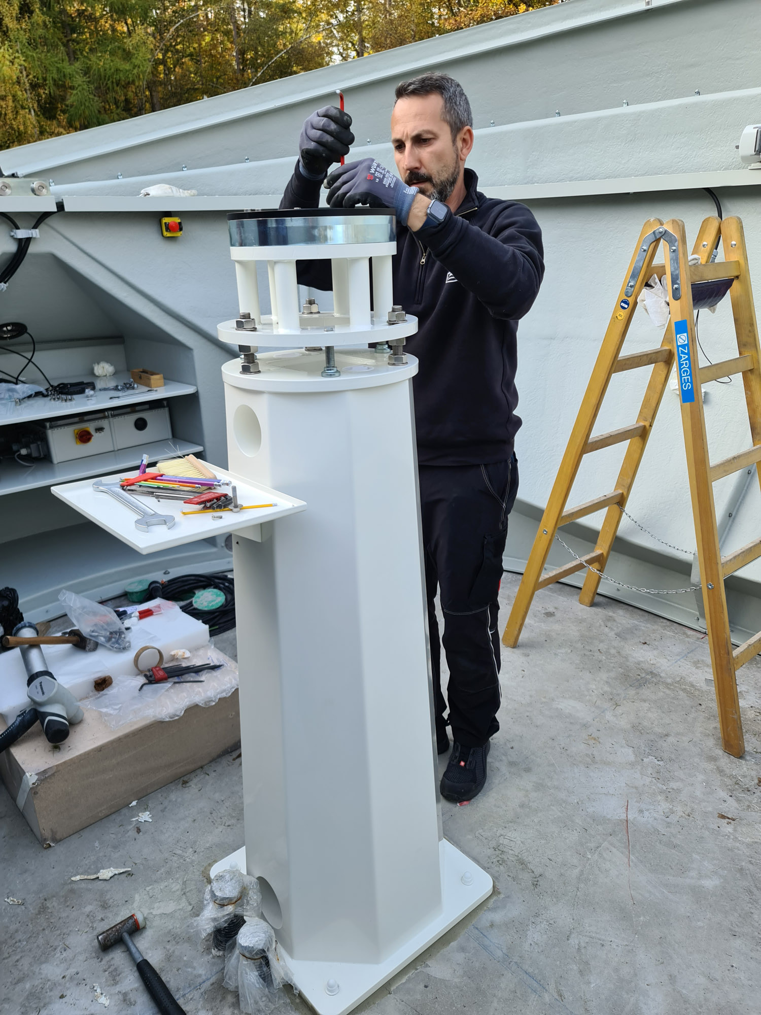 Nach Fertigstellung unserer massiv betonierten Kuppelbasis und der vorbereitenden Arbeiten war es Ende Oktober 2021 endlich soweit, und die Kuppel samt massiver Stahlsäule und 10 Micron GM 3000 Montierung wurden geliefert. Es war faszinierend zu beobachten, mit welcher Professionalität, Geschwindigkeit und Sorgfalt die Mitarbeiter von Baader Planetarium den Aufbau der Kuppel und die Installation der Montierung bewerkstelligten und dabei auch noch die Zeit fanden, unsere vielen Fragen zu beantworten, Tipps zu geben und uns eingehend einzuweisen. Besser geht es nicht! Die Kuppel hat nun den ersten Winter überstanden; wir konnten weder Undichtigkeiten noch Kondenswasser an der Innenseite oder irgendwelche anderen Probleme feststellen. Die Qualität der bis ins Detail durchdachten Konstruktion ist wirklich überzeugend.