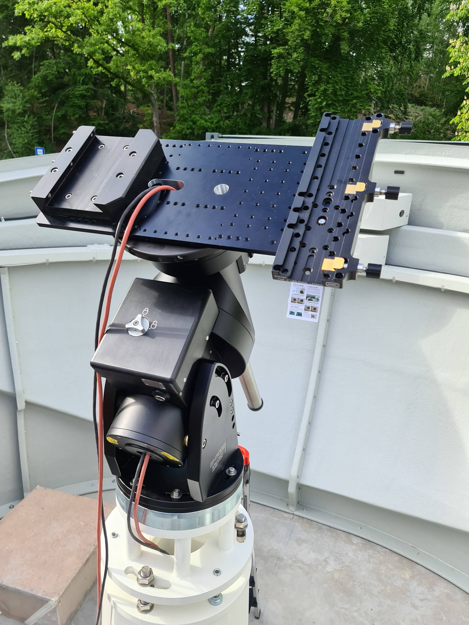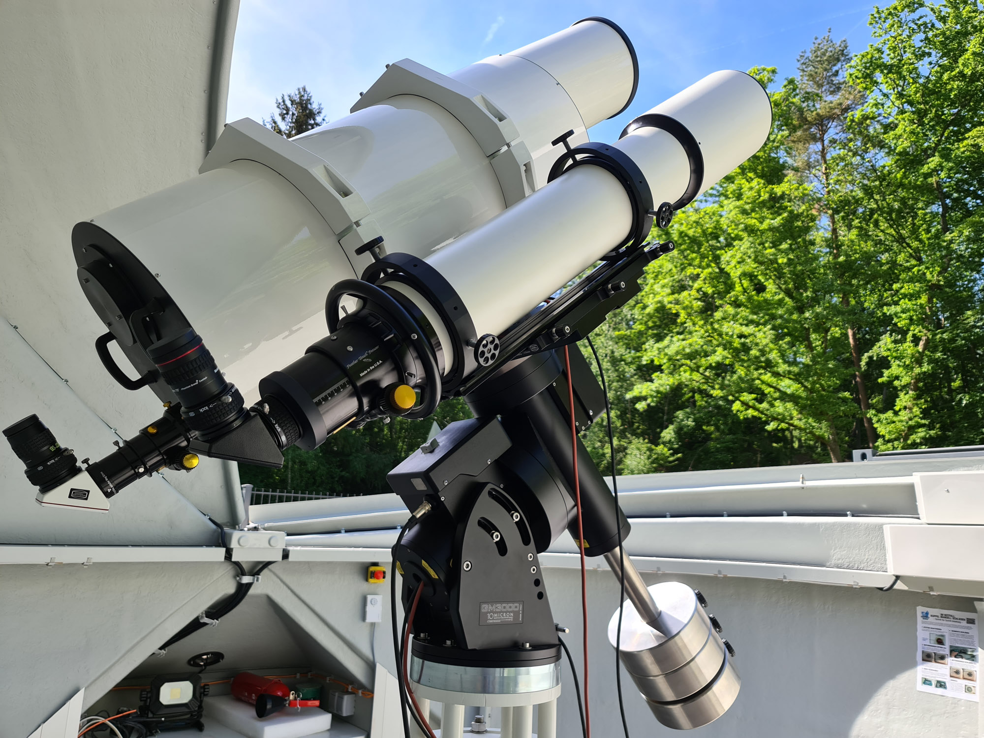 Nachdem vor kurzem auch der bestellte TEC 160 FL Refraktor geliefert wurde, konnten wir nun auch die astronomischen Beobachtungsinstrumente auf die Montierung bringen und damit die Voraussetzung für die baldige Aufnahme des Beobachtungsbetriebes schaffen. Die Montage und Balancierung des TEC 160 FL parallel zu unserem 45 kg schweren, 200 mm Eigenbau-Faltrefraktor mit Zeiss-Objektiv gelang dank des hervorragenden Montagesystems aus 8‘‘-Doppelmontageplatte, zugehöriger Planewave-Klemme und einer 3", 370mm Pan EQ Klemme in Verbindung mit den unterstützenden Routinen der GM 3000 völlig problemlos. Die auf unseren Wunsch am Montagesystem angebrachten Zusatzbohrungen und Ausfräsungen passten perfekt.