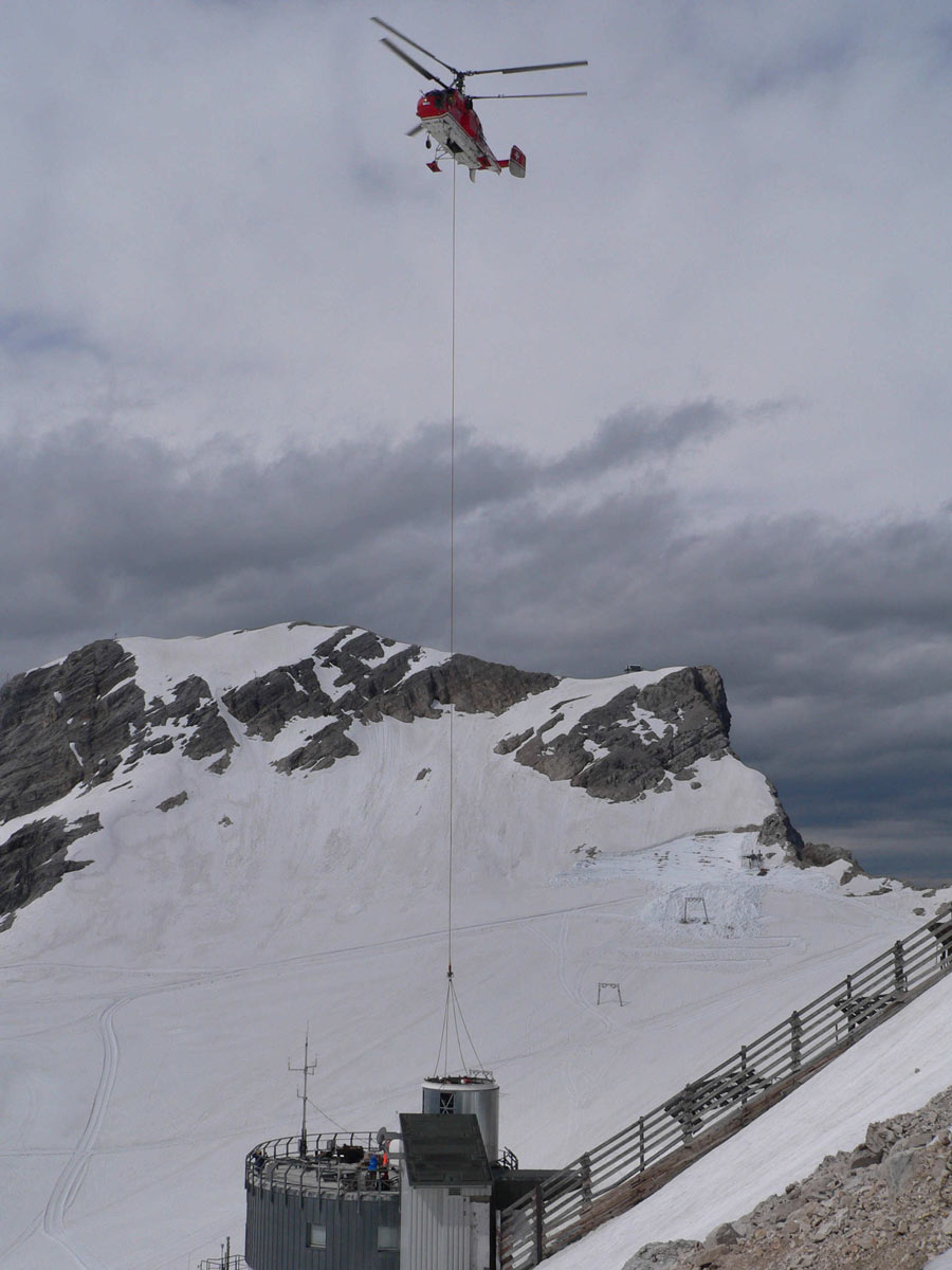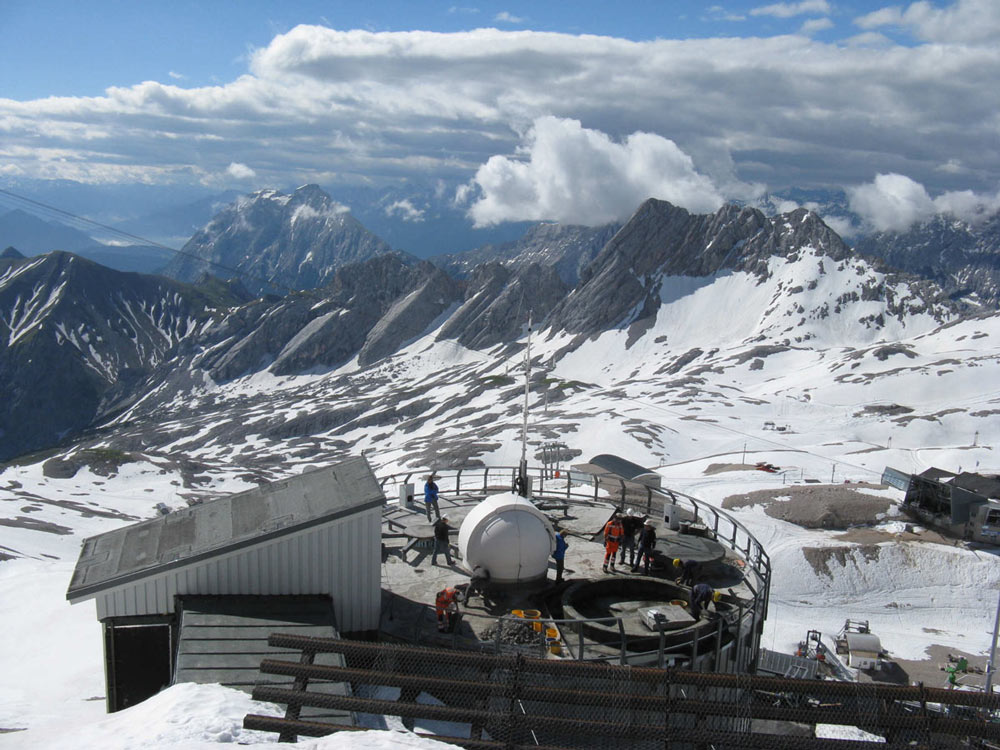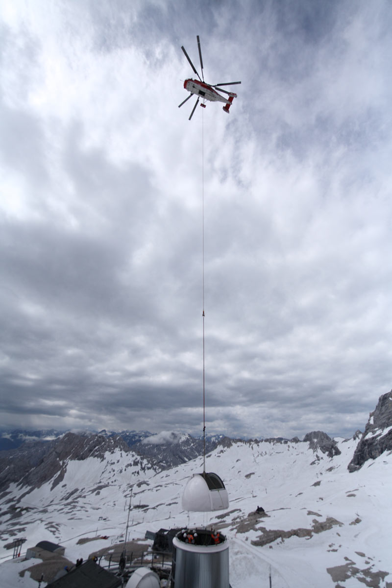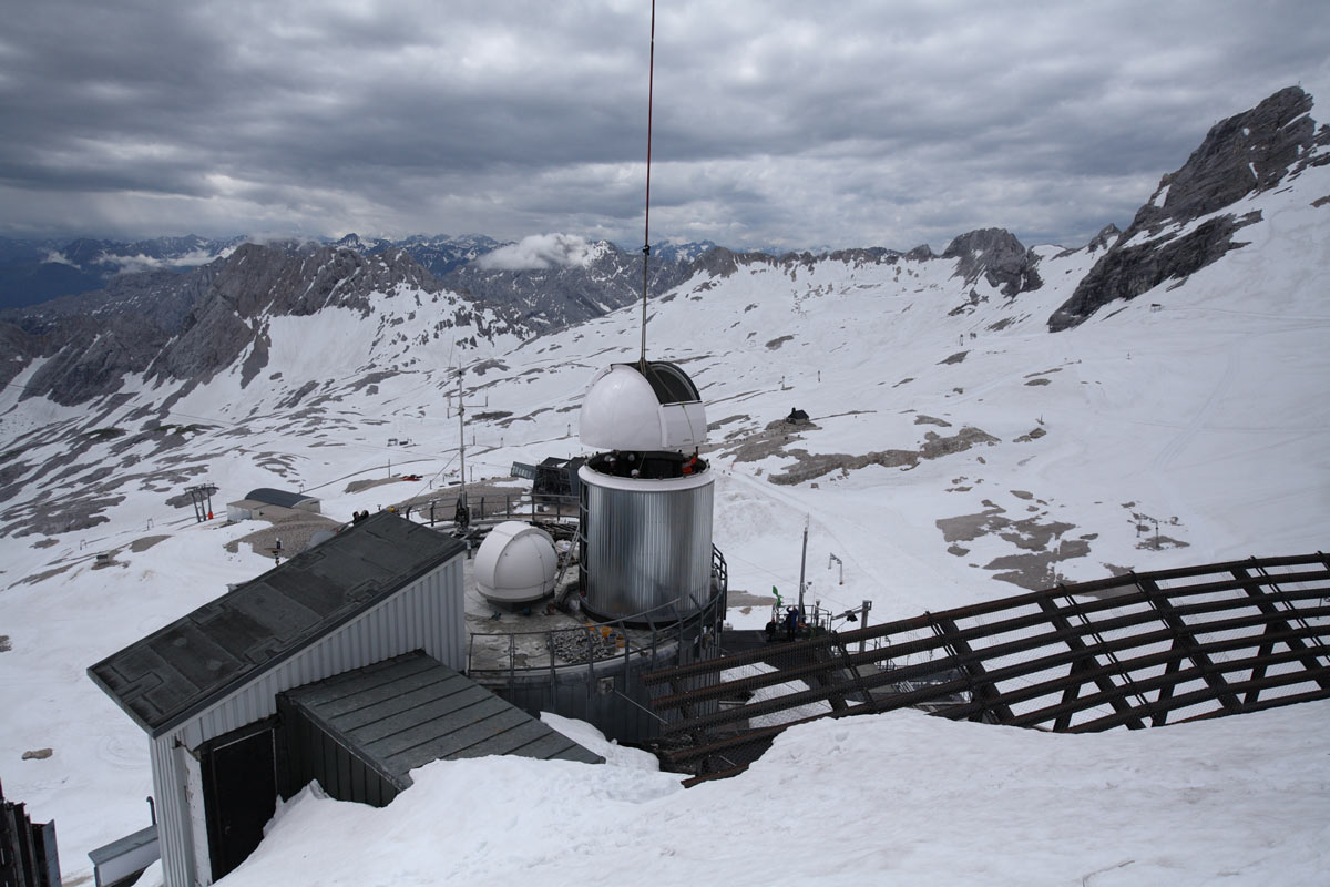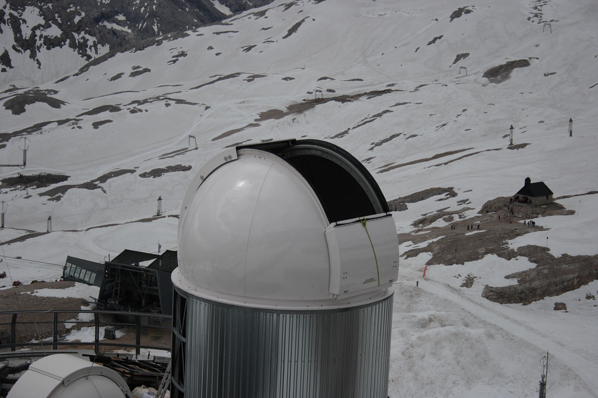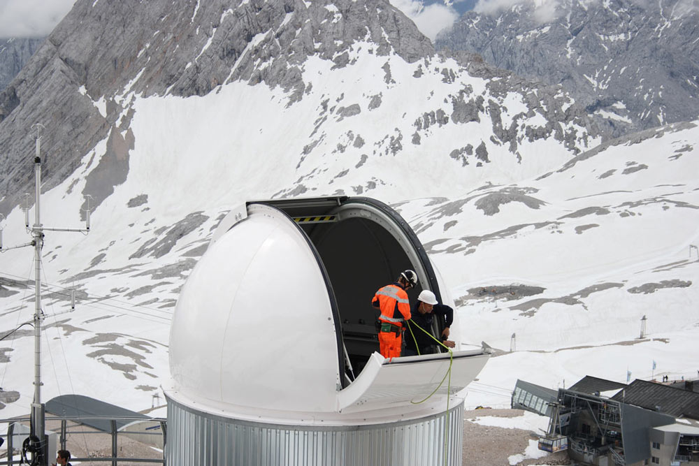 Eines dieser Projekte ist die Messung der Verteilung des Klimagases Wasserdampf in der Atmosphäre. Für diese Forschungen hat das Karlsruher Institut für Technologie (KIT) zwei Kuppeln von Baader Planetarium erworben (2,6M und 4,2M), um die hochempfindlichen Messinstrumente vor den harschen Umweltbedingungen auf der Zugspitze zu schützen.