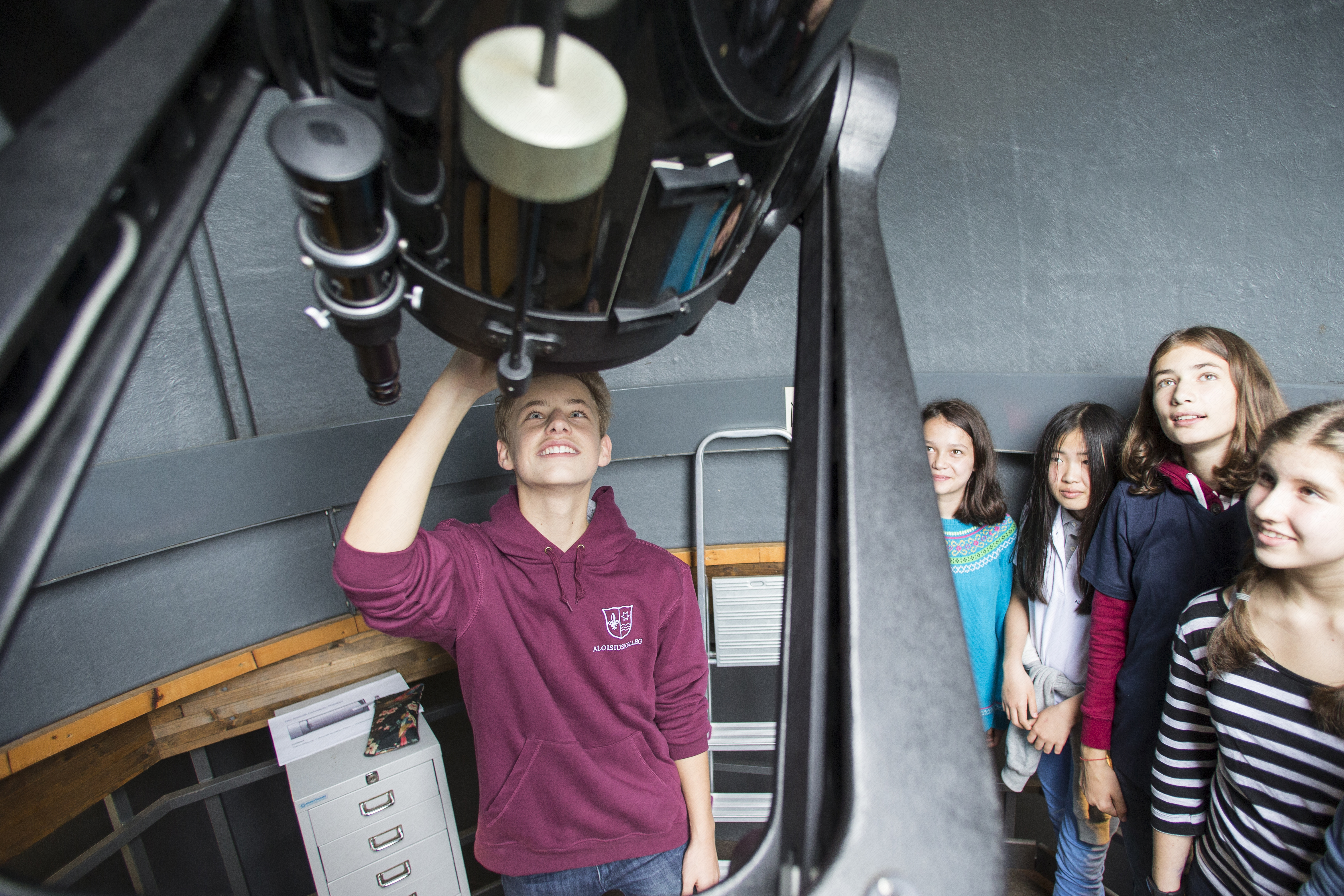 Im Sommer 1990 wurde die Glasfaserkuppel auf dem Dach des Aloisiuskollegs mit einem Schmidt-Cassegrain-Teleskop von 14 Zoll Öffnungs-Durchmesser (etwa 35 cm) ausgerüstet und dann im Oktober feierlich eingeweiht. Doch was sind 25 Jahre im Vergleich zu der Zeit, die das Licht braucht, um von den fernen Sternen bis zu uns zu gelangen? Die Sternhaufen M37 oder M38 zum Beispiel, die im Sternbild Fuhrmann liegen, sind 4000 Lichtjahre von uns entfernt. Wenn Schülerinnen und Schüler davon nicht nur lesen, sondern selbst die Faszination erleben wollen, bei klarem Himmel die Planeten und Sternhaufen, Sternnebel und andere interessante Objekte am Himmel durch das Spiegelteleskop in kleinen Gruppen zusammen mit Lehrern, Eltern und Amateuren zu beobachten, dann sind sie bei der Ako-Sternwarte genau richtig. Vor einigen Jahren konnte das Teleskop mit Hilfe einer großzügigen Unterstützung durch den Förderverein optisch und mechanisch generalüberholt und die vollautomatische Steuerung repariert werden. Zudem ermöglicht eine neue Digitalkamera nun einfache Planetenfotografien. Über aktuelle Ereignisse und Beobachtungstermine werden wir an der Tür der Sternwarte informieren. Clear Skies!