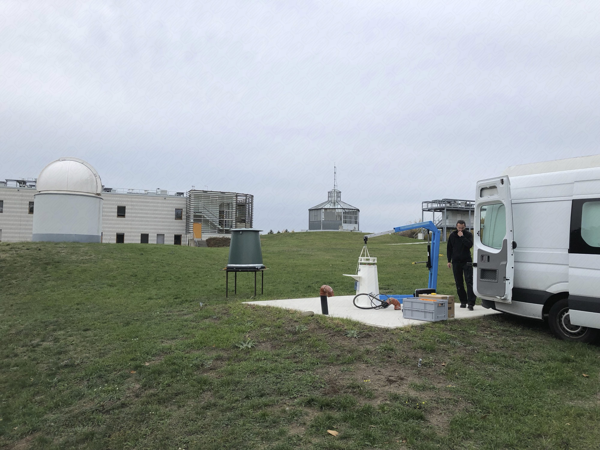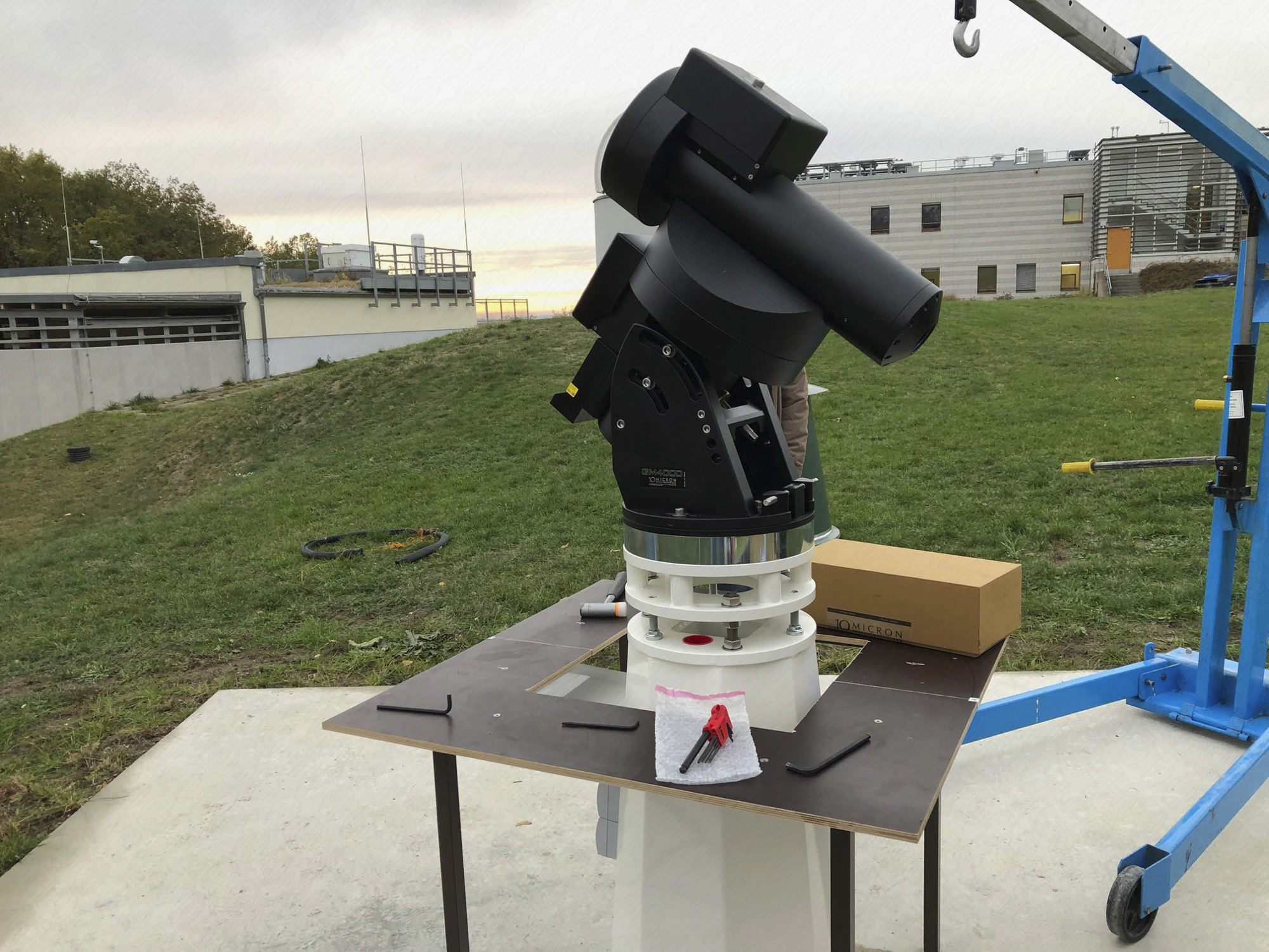 Already in 2012 we installed a 3.2m classic dome for the meteorological observatory of the DWD (german weather service). Now a 3.5 meter AllSky dome should follow. In November 2018 the mount was delivered and installed, which "hibernated" in a self-made protection due to the still missing dome. Later an atmospheric research device, which has to follow the sun, will be installed on the mount.