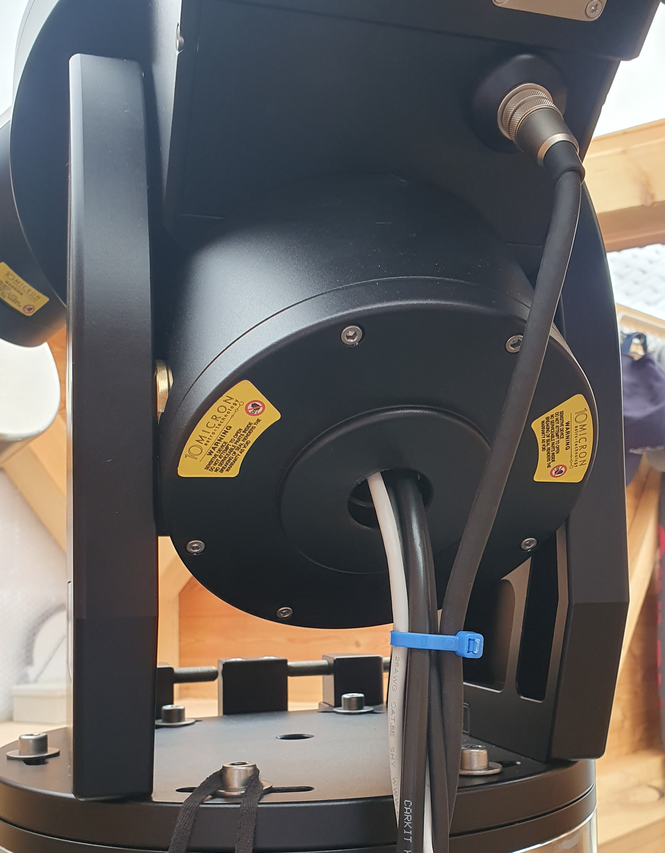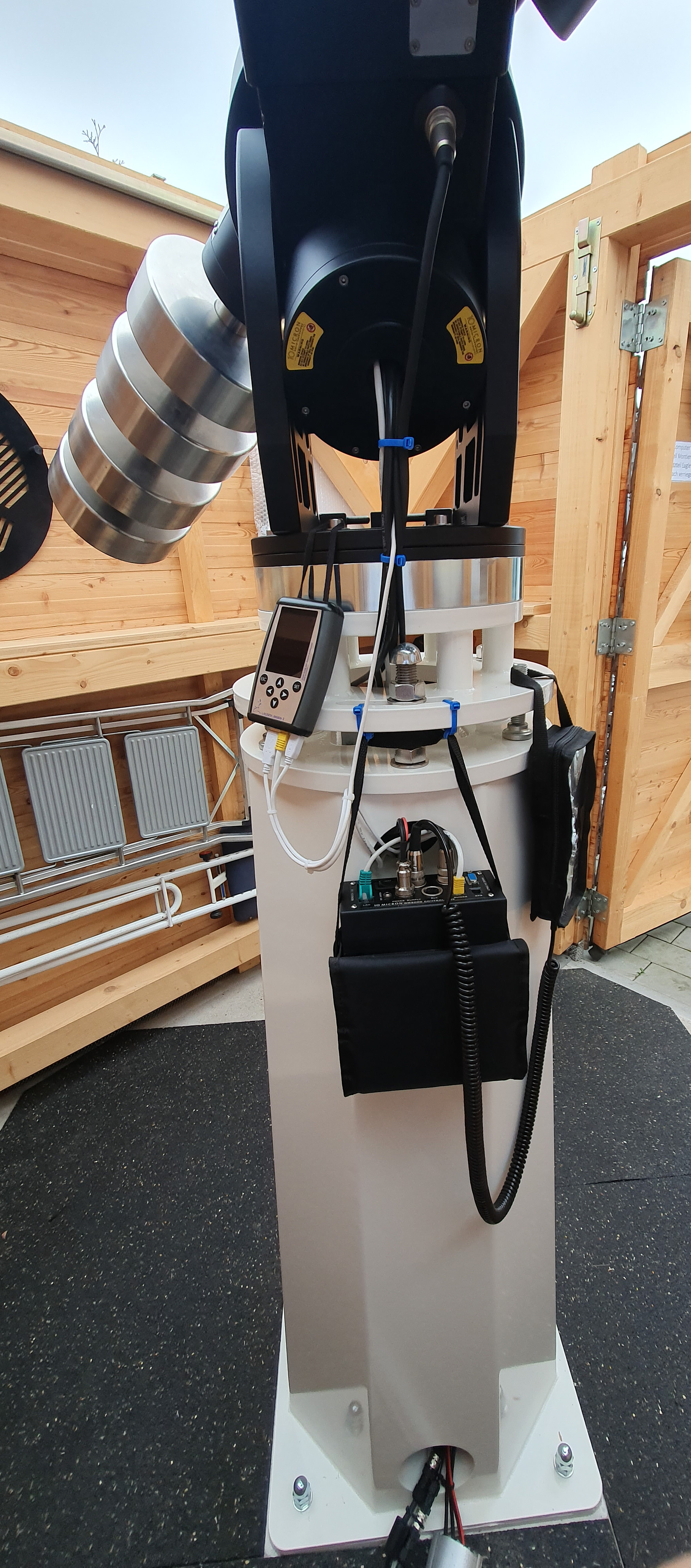 The hand control box, if required, is user friendly and of course made of metal. All cable connections are screwed. The internal passage of the cables through the mount axis is well solved and has plenty of space. In my case 2 power cables (for powering the minicomputers) and 3 LAN cables as well as a USB cable.
